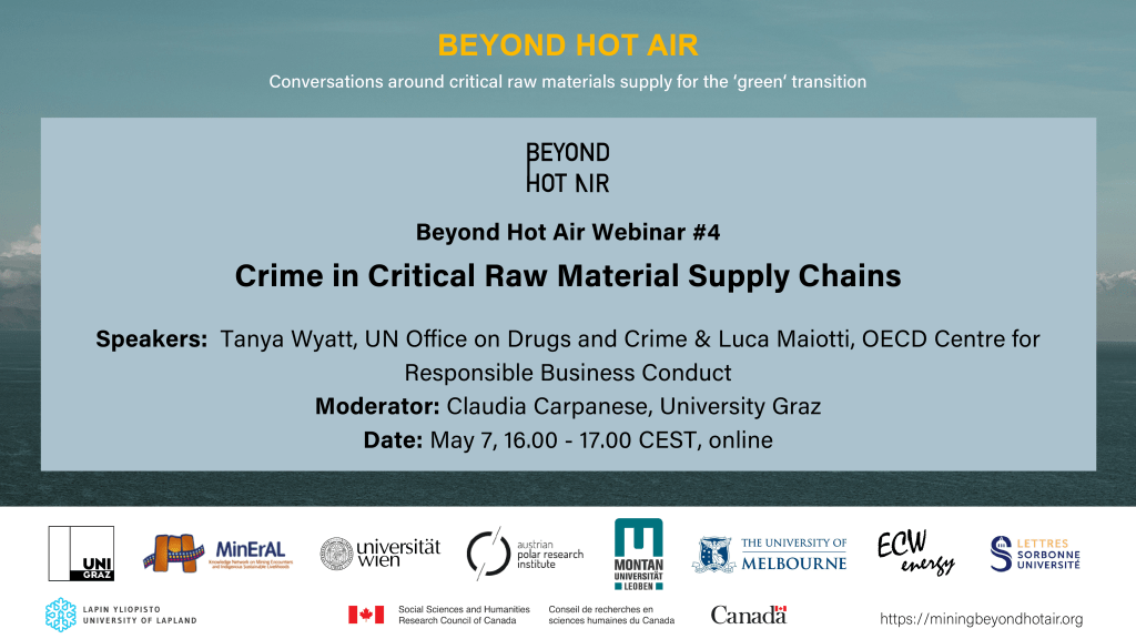 The project Beyond Hot Air is a conversation. It is an international, transdisciplinary multi-stakeholder initiative that explores the complex landscape of critical raw materials (CRM) supply for the ‘green’ transition. The project is based at the University of Vienna, AT and associated to/funded by the Canadian research network MinErAL.